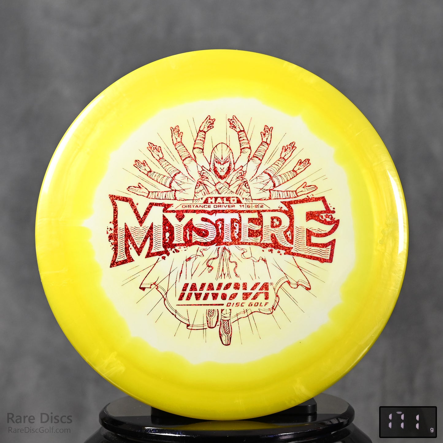 The Mystere is meant for two things: glide and distance. It's an easy to throw driver for players looking to step up to a wider rim. The Mystere has plenty of turn and a decent fade, meaning that lower power players will be able to carve swooping S-curve lines, while high power players will find it flips up and flies straight for ages. Reach for the Mystere for tailwind drives and big distance.
