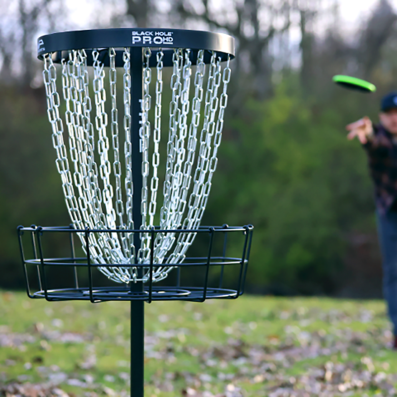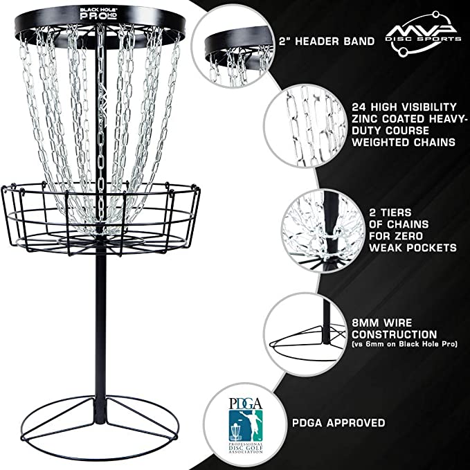 The MVP Black Hole Pro HD is the top dog in premium portable baskets. It is designed for the ultimate putting experience in the field and on the course. It features a sturdy chain rack, deeper cage and stronger base.